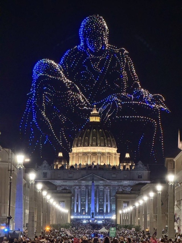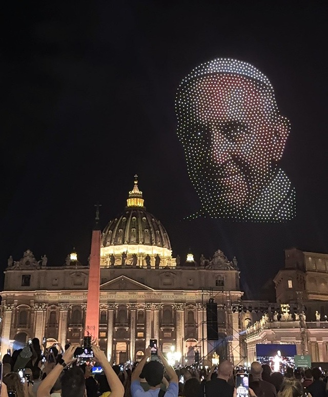 El espectáculo incluyó un show de drones y luces, que dibujaron en el cielo imágenes emblemáticas de la cristiandad, entre ellas, fragmentos de la Capilla Sixtina y el rostro sonriente del difunto Papa Francisco.