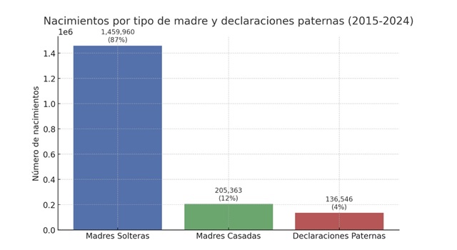 Puntualizó que ha identificado, a partir de los datos de la Oficina Nacional de Estadística (ONE) y de la Junta Central Electoral (JCE), que en los últimos 10 años (2015-2024), de los 1,680,217 nacidos, el 87 % (1,459,960) son hijos de madres solteras, y de estos, solo el 4 % (136,546) han sido reconocidos por sus padres ante las Oficialías del Estado Civil.