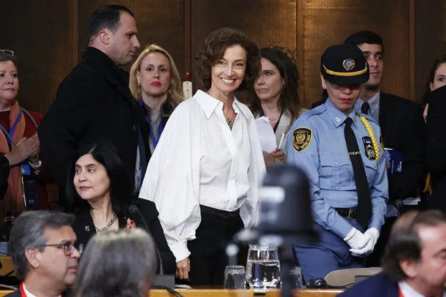 La directora general Unesco, Audrey Azoulay, asiste a la Cumbre Mundial sobre Docentes este jueves, en la Sede Central de la Comisión Económica para América Latina y el Caribe de las Naciones Unidas (CEPAL), en Santiago de Chile. EFE/ Elvis González
