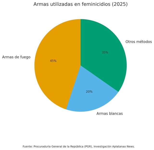 Para cometer los crímenes, se utilizaron armas de fuego en el 44% de los casos, armas blancas en un 20% y otros métodos en el 34%. Menciono estos datos con el propósito de contribuir a la adopción de medidas preventivas, siendo consciente, sin embargo, de la importancia de evitar descripciones innecesarias de los feminicidios. En muchos de estos casos, los agresores son miembros de la Policía o de las Fuerzas Armadas.