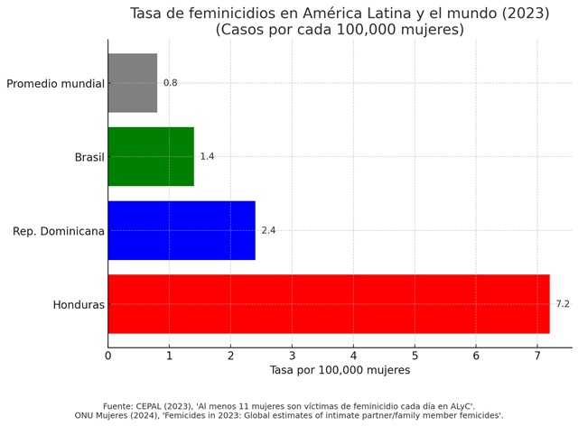 El estudio ubica la tasa de feminicidio en República Dominicana en 2.4 por cada 100,000 mujeres, una de las más altas de la región, solo superada por Honduras (7.2).