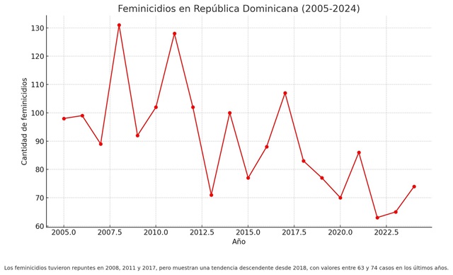 Además de las cifras de la PGR, la Oficina Nacional de Estadística (ONE) publicó el Compendio de Estadísticas de Mujeres Fallecidas en Condiciones de Violencia 2020-2024, en el que se registran 134 casos en 2020, 144 en 2021, 163 en 2022, 137 en 2023 y 130 en 2024 (preliminar), con un promedio anual de 141 muertes.