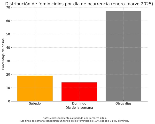 El sábado es el día más letal para las dominicanas (19%), seguido por el domingo (14%), lo que confirma que los fines de semana concentran una tercera parte de los casos. En cuanto a los horarios, la violencia se reparte casi por igual: 51% en el día y 49% en la noche.