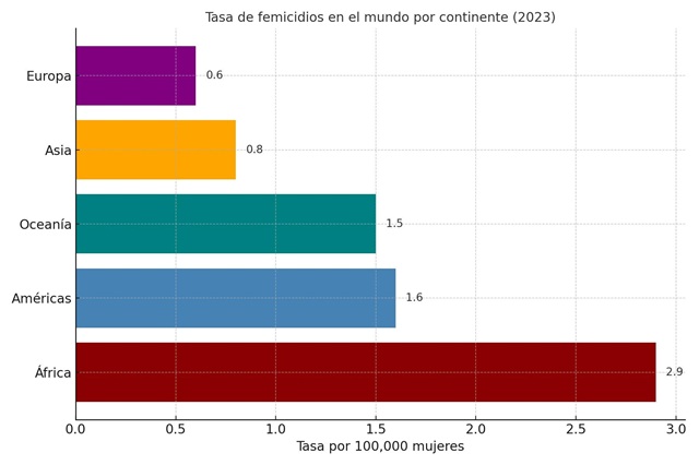El documento confirma al femicidio como un problema global: África encabeza las cifras absolutas y relativas con 21,700 asesinatos (2,9 por cada 100,000 mujeres), seguida de América y Oceanía con tasas de 1,6 y 1,5 respectivamente. En Asia (0,8) y Europa (0,6) los números son menores, pero igualmente preocupantes. La ONU advierte que la escala real es aún mayor, ya que en casi 4 de cada 10 asesinatos de mujeres no se determina si hubo motivación de género por deficiencias en la investigación y el registro.